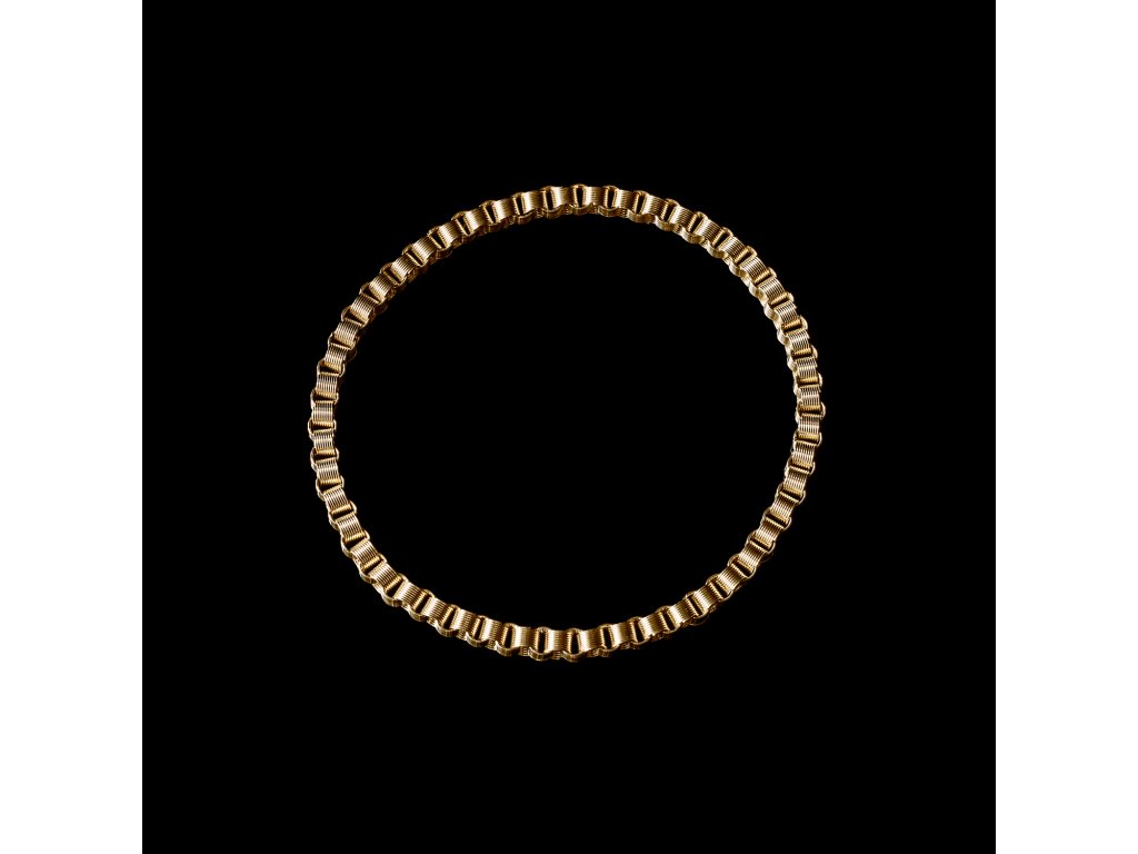Náramek je vyrobený z nerezových pružinek, které jsou do sebe namotávány ručně tak, jako když se připevňuje na kroužek klíč. Každá pružinka má průměr 5mm. Náramek je galvanicky pozlacený.